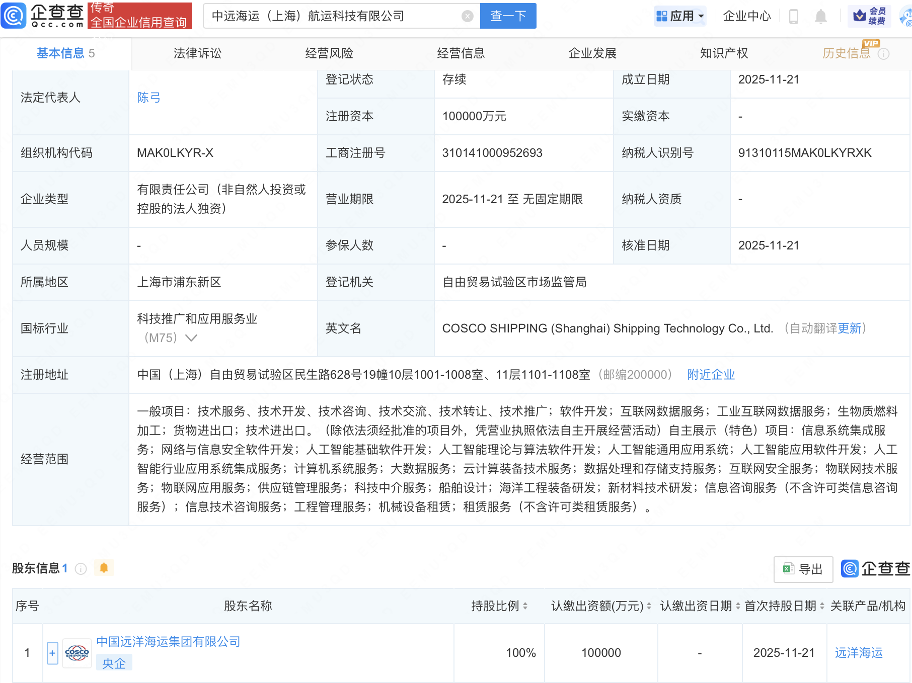 近日,中远海运(上海)航运科技有限公司成立,注册资本10亿元,经营范围包含:人工智能理论与算法软件开发;人工智能通用应用系统;人工智能应用软件开发;人工智能行业应用系统集成服务等。企查查股权穿透显示,该公司由中国远洋海运集团有限公司全资持股。